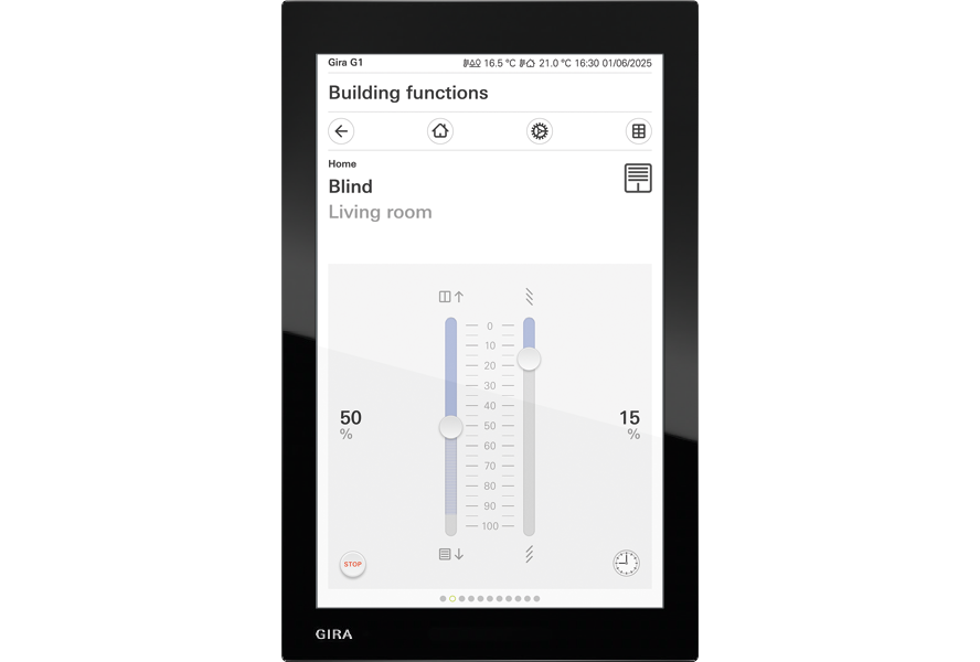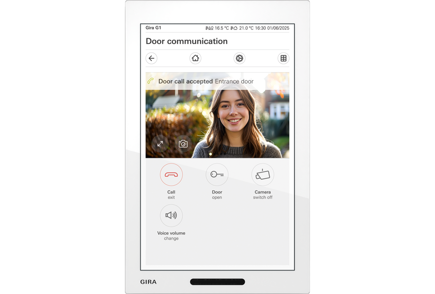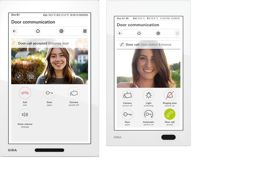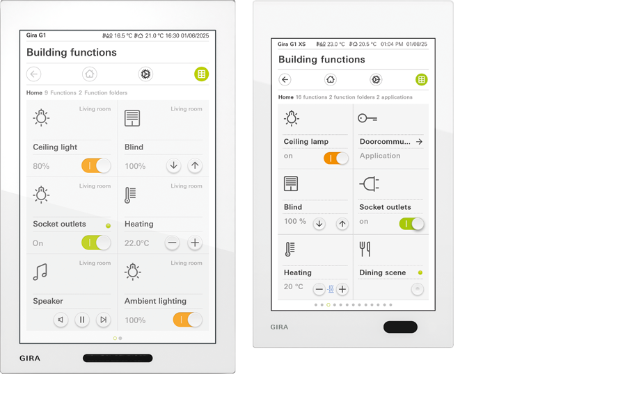 The Gira G1 is the premium solution with a 7-inch display, advanced sensor technology, HomeServer compatibility and more visualisation options. The Gira G1 XS is more compact, offers a 6-inch display and focuses on essential Smart Home functions, making it ideal for cost-optimised projects. Both devices support Gira One, Gira X1, KNX Secure and door communication via DCS or SIP.